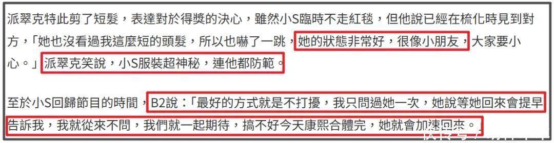 另外,虽然小S这次现身金钟奖,但何时回归节目还没有准确消息。制作人B2此前接受采访也没给出准信,称他也在等小S通知,“我就从来不问,我们就一起期待”。